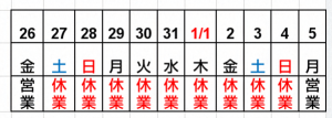 休業期間:2025年12月27日(土) ~ 2026年1月4日(日)