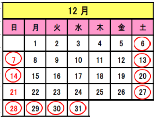 こんにちは、シンコウ製作所です。 今年も残り1ヶ月を切りました。 インフルエンザも流行しています。 皆様お気をつけください。 今月の営業について、案内いたします。 ○は休業日となっております。 今月も、よろしくお願いいたします。